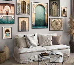 Revestimientos de paredes, papeles pintados, alfombrillas, embalajes de tela, muebles de piel, cuadros decorativos, decoración artesanal, etc.